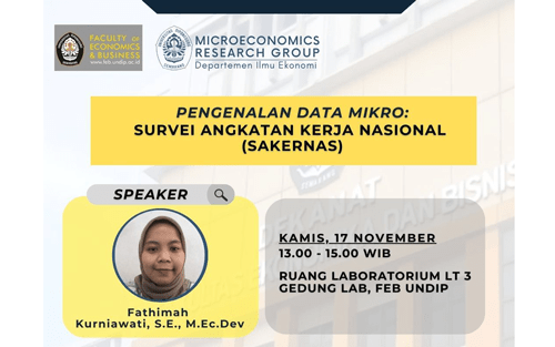 Kamis, 17 November 2022 Pukul 13.00 – 15.00 WIB Tempat: Ruang Laboratorium Lantai 3 Gedung Laboratorium Perpustakaan, FEB Undip Microeconomics Research Group FEB Undip akan melaksanakan Pengenalan Data Mikro: Survei Angkatan Kerja Nasional (SAKERNAS). Pembicara: Fathimah Kurniawati, S.E., M.Ec.Dev. Pendaftaran kegiatan dapat dilaksanakan di link: https://bit.ly/SosialisasiSAKERNASFEB/ Informasi lebih lengkap dapat menghubungi narahubung: Alfi Fatoni (082221067924)