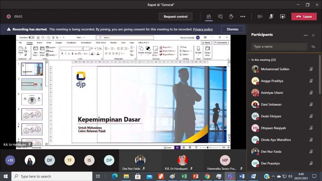 Pada masa pandemi covid-19 ini pelaksanaan Pelatihan dan Seleksi Relawan Pajak 2021 dilaksanakan secara daring (dalam jaringan), kegiatan tersebut dilaksanakan pada tanggal 26 dan 27 Januari 2021 dan diikuti 20 peserta pelatihan dan diseleksi menjadi 10 peserta yang dapat menjadi Relawan Pajak 2021, sesuai kuota yang diberikan oleh DJP Kanwil Pajak I Jawa Tengah.