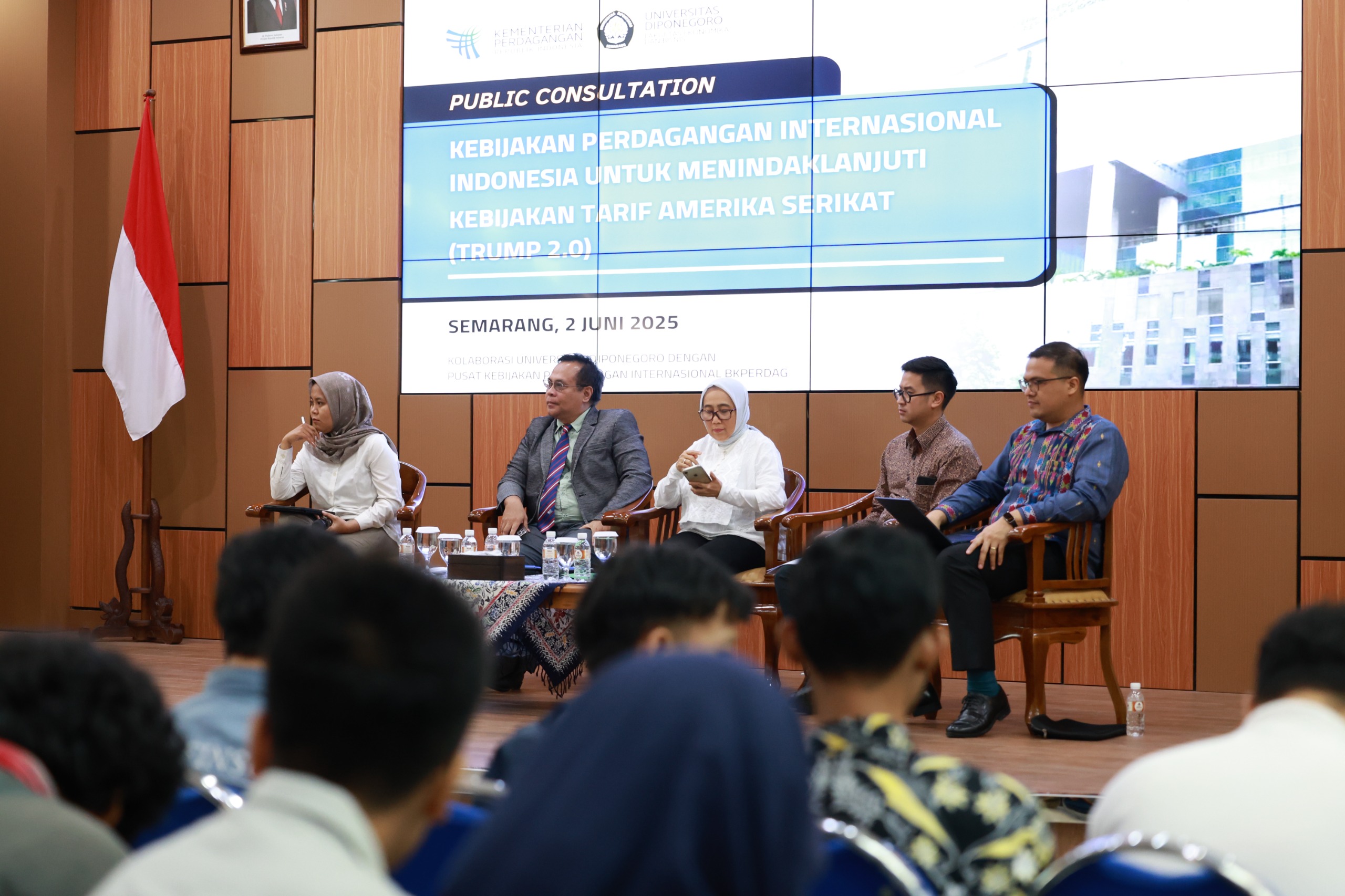 Semarang, 2 Juni 2025 — Fakultas Ekonomika dan Bisnis Universitas Diponegoro (FEB Undip) bersama Kementerian Perdagangan Republik Indonesia menyelenggarakan Konsultasi Publik bertajuk “Kebijakan Perdagangan Internasional Indonesia untuk Menindaklanjuti Kebijakan Tarif Amerika Serikat.” Kegiatan ini berlangsung di Hall Pertamina FEB Undip sebagai bagian dari forum diskusi strategis antara akademisi dan pemerintah dalam merespons dinamika perdagangan global.