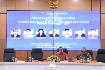 Semarang – Periode pemilihan Dekan Fakultas Ekonomika dan Bisnis Universitas Diponegoro (FEB Undip) telah mencapai tahap pemaparan rencana kerja calon. Acara yang berlangung secara hybrid baik daring melalui livestreaming youtube, serta daring di Hall Pertamina Gd. Dekanat FEB Undip Semarang, digelar pada hari Senin (02/10). Setelah mengalami perpanjangan masa pendaftaran, sebelumnya panitia pemilihan berhasil menjaring tujuh kandidat dekan yang memenuhi syarat, namun terdapat satu kandidat calon dekat yang mengundurkan diri. Adapun keenam calon tersebut adalah Prof. Anis Chariri, Ph,D. , Dr. Endang Kiswara , Prof. Faisal, Ph,D. , Prof. Dr. Harjum Muharam , Dr. Jaka Aminata, dan Dr. Jaka Isgiyarta.