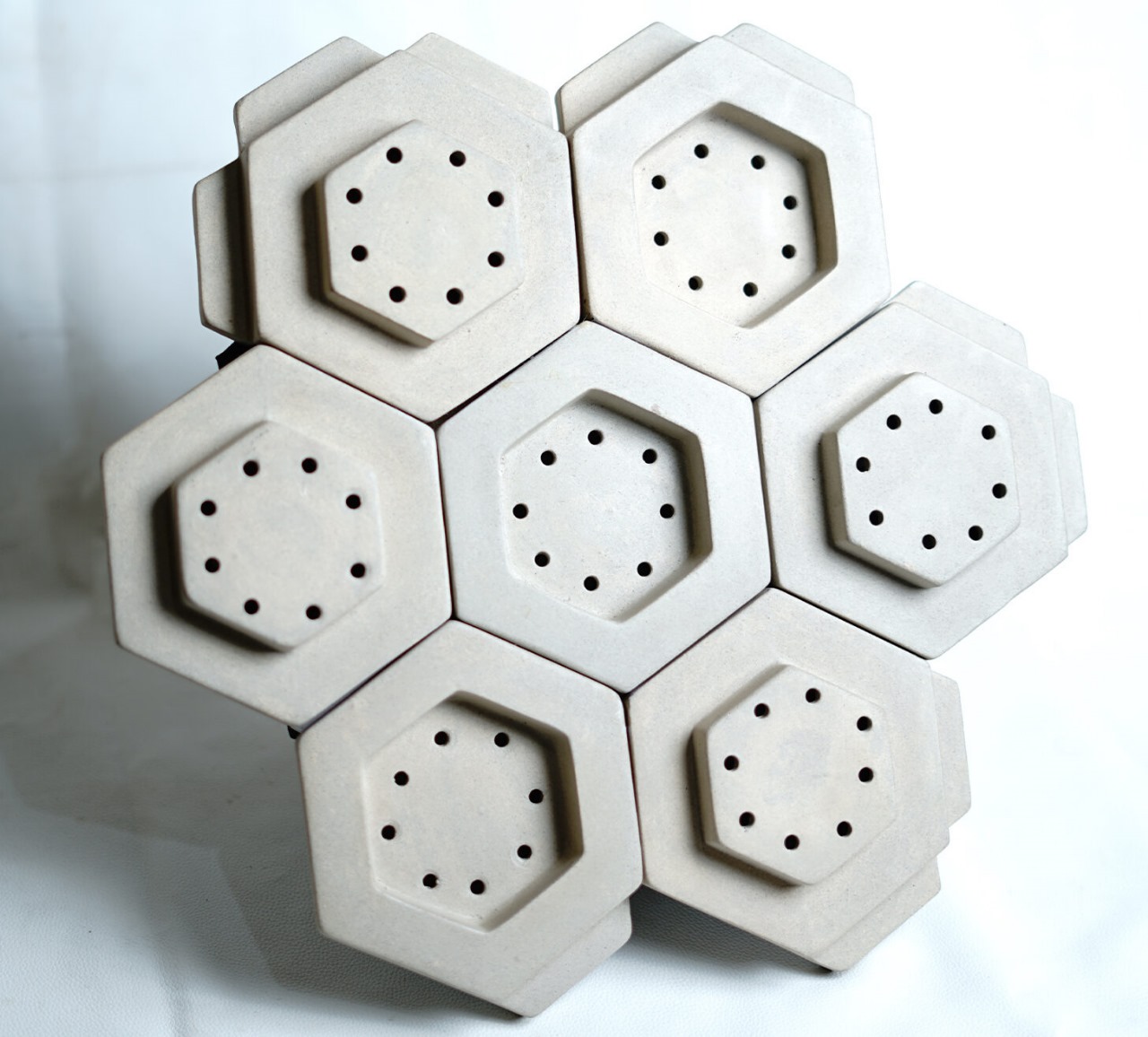 Hexara Ceramics merupakan material keramik dinding fungsional berbentuk heksagonal dan memiliki sistem kunci unik yang memungkinkan mereka terkunci satu sama lain tanpa perlu menggunakan adhesif tambahan. Ini membuat instalasi menjadi lebih mudah dan mengurangi penggunaan bahan kimia yang berpotensi merusak lingkungan.