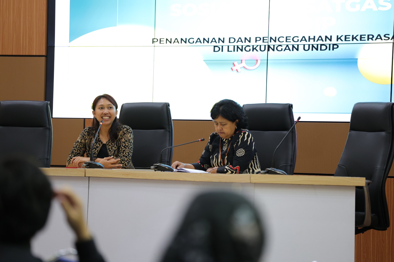 Dua narasumber dari Satgas PPKPT Undip turut hadir sebagai pemateri utama dalam pelatihan ini, yaitu Annastasia Ediati, S.Psi., M.Sc., Ph.D., dari Fakultas Psikologi, dan Dr. Anak Agung Sagung Manik Mahachandra Jayanthi Mertha, S.T., M.Sc., dari Fakultas Teknik. Keduanya menyampaikan materi secara interaktif dan aplikatif terkait teknik komunikasi dan pemeriksaan dalam penanganan kasus kekerasan, dengan pendekatan berbasis korban.