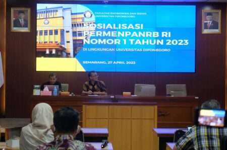 Sehubungan telah diterbitkannya Peraturan Menteri Pendayagunaan Aparatur Negara dan Reformasi Birokrasi Republik Indonesia Nomor 1 Tahun 2023 tentang Jabatan dan Fungsional dan Kepangkatan Dosen, Fakultas Ekonomika dan Bisnis Universitas Diponegoro (FEB Undip) telah melaksanakan sosialisasi mengenai “Tindaklanjut Implementasi PermenPAN RB Nomor 1 tahun 2023”. Kegiatan ini dihadiri oleh seluruh Dosen FEB Undip dan sebagian tenaga kependidikan. Kegiatan telah terlaksana secara hibrida, baik secara daring melalui zoom meeting ataupun luring di ruang Sidang Utama Gedung Dekanat FEB Undip pada hari Kamis tanggal 27 April 2023.