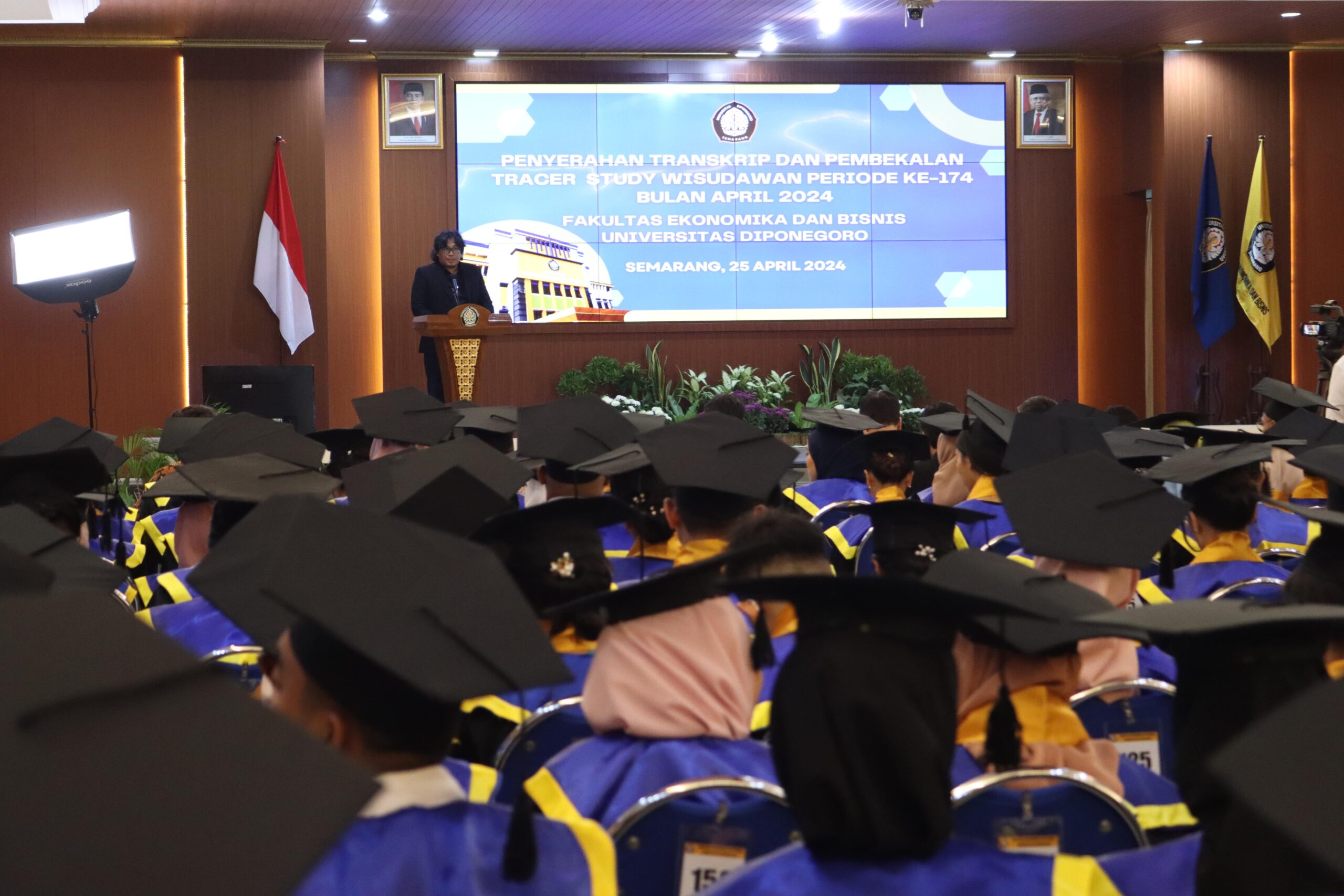 Semarang, 25 April 2024, sebanyak 236 mahasiswa dan mahasiswi yang meraih gelar Sarjana (S1), Magister (S2), dan Doktor (S3) dari Fakultas Ekonomika dan Bisnis Universitas Diponegoro telah mengikuti Prosesi Penyerahan Transkrip dan Pembekalan Tracer Study bagi wisudawan periode ke-174. Kegiatan ini berlangsung di Hall Gedung Laboratorium Kewirausahaan FEB Undip dimulai pukul 14.00 WIB hingga selesai.